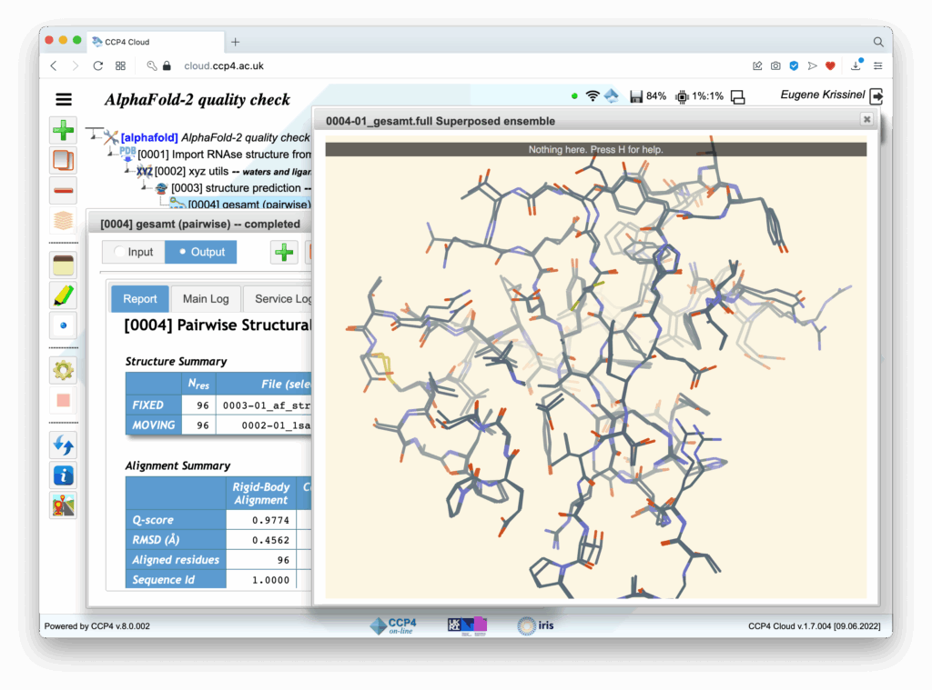 Comparison of experimentally determined and AlphaFold-predicted structures of Ribonuclease, a medium-size protein that catalyzes the degradation of RNA into smaller components. The overall difference is less than 0.5Å r.m.s.d. and can be seen as doubling of covalent links between atoms in the picture. For reference, the experimental structure resolution is 1.8 Å. Given experimentally determined electron density (not shown in the Figure), very little effort is required to make the way from predicted to experimentally confirmed structure as compared with the conventional procedure of phasing and building structures “from scratch”. The structure prediction and comparison were done in CCP4 Cloud, a new graphical system for remote, in-browser, structure solution that gained a considerable popularity during the pandemic due to the overall shift to remote working patterns [9].